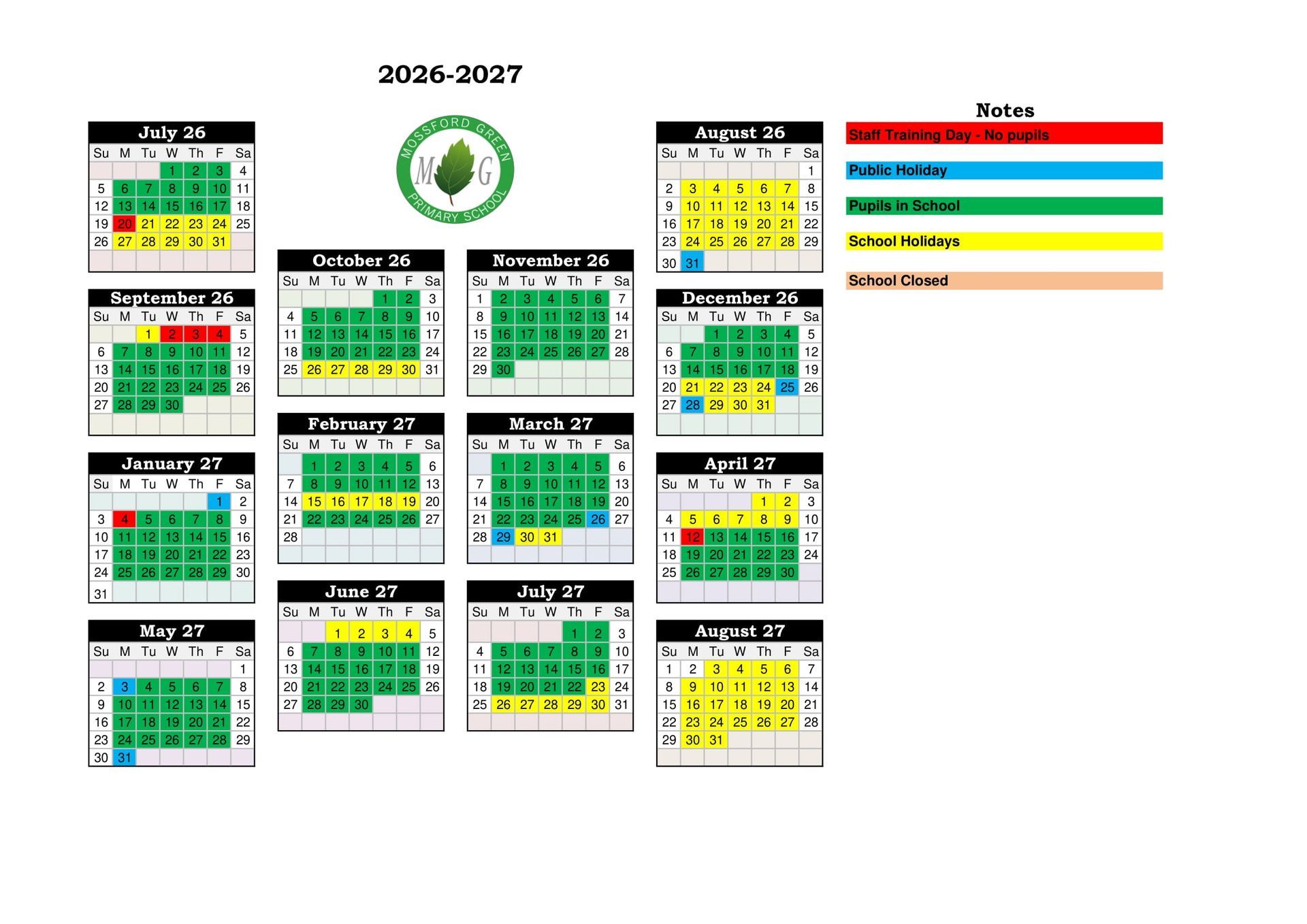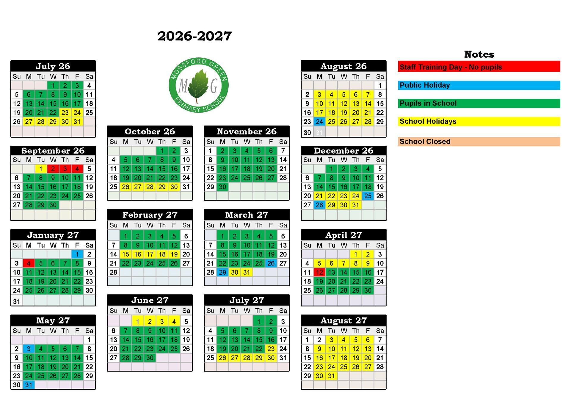 - Staff Training Day: Wednesday 2nd, Thursday 3rd & Friday 4th September 2026